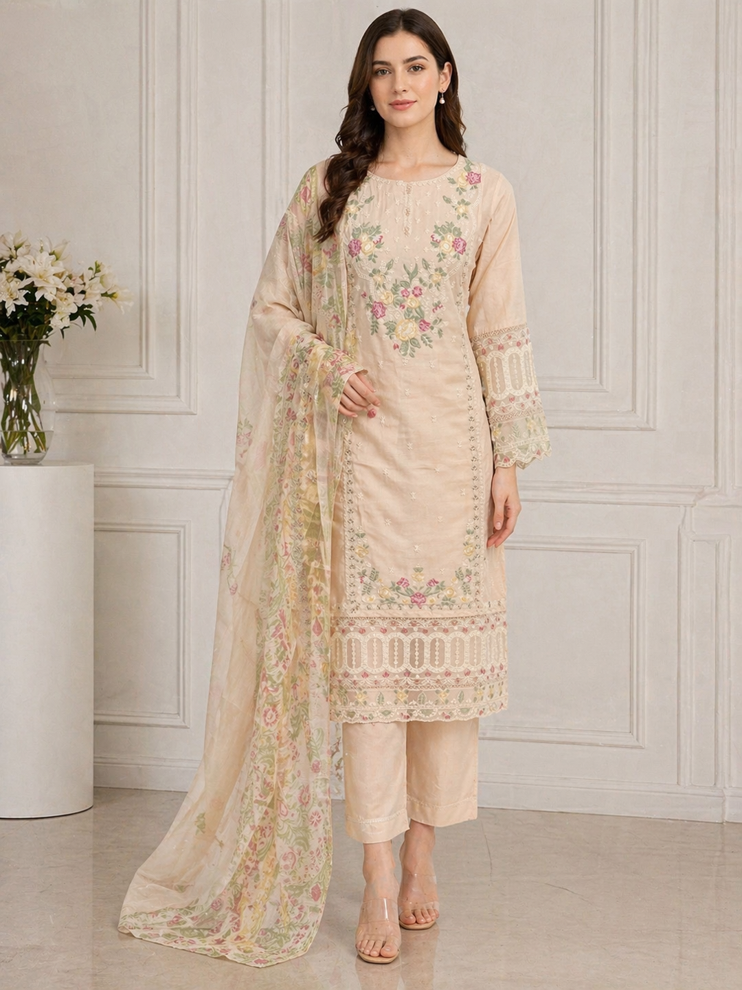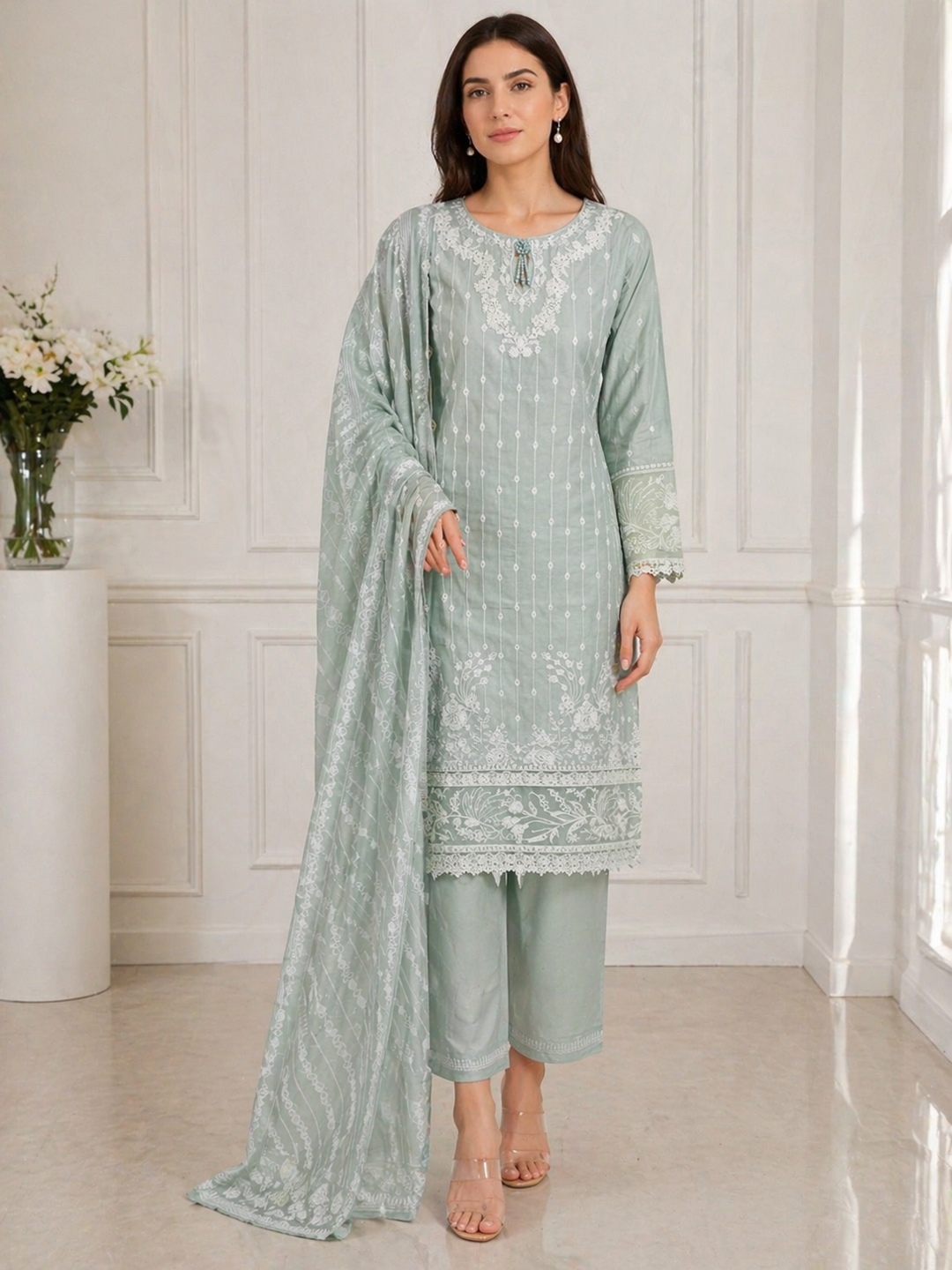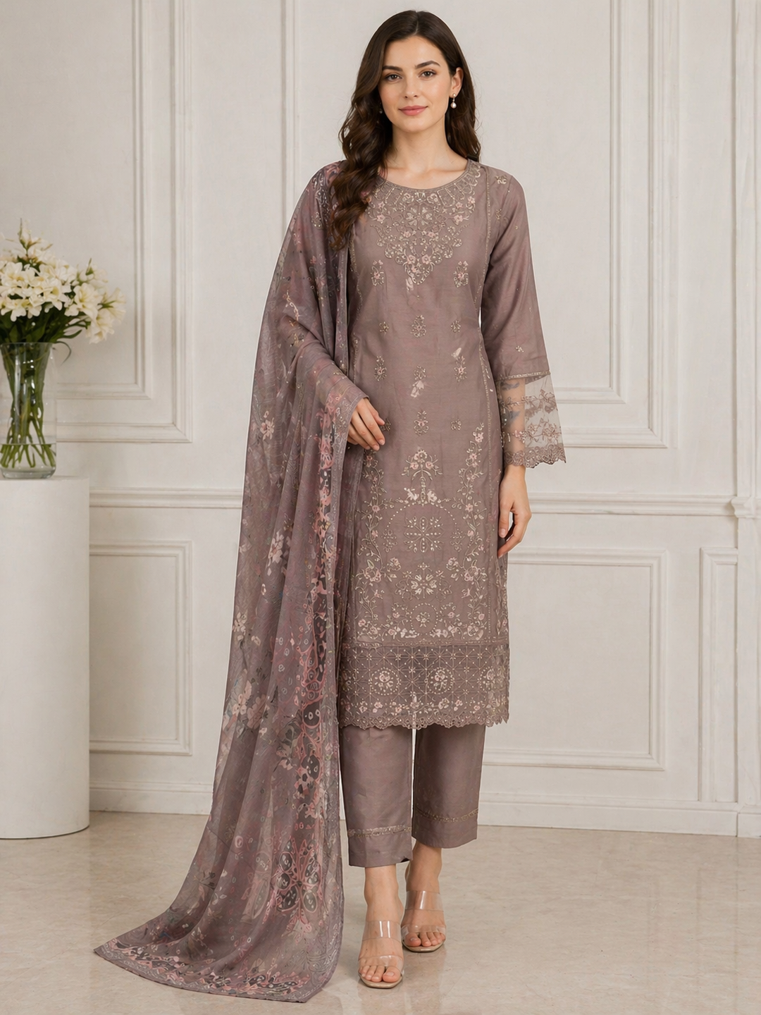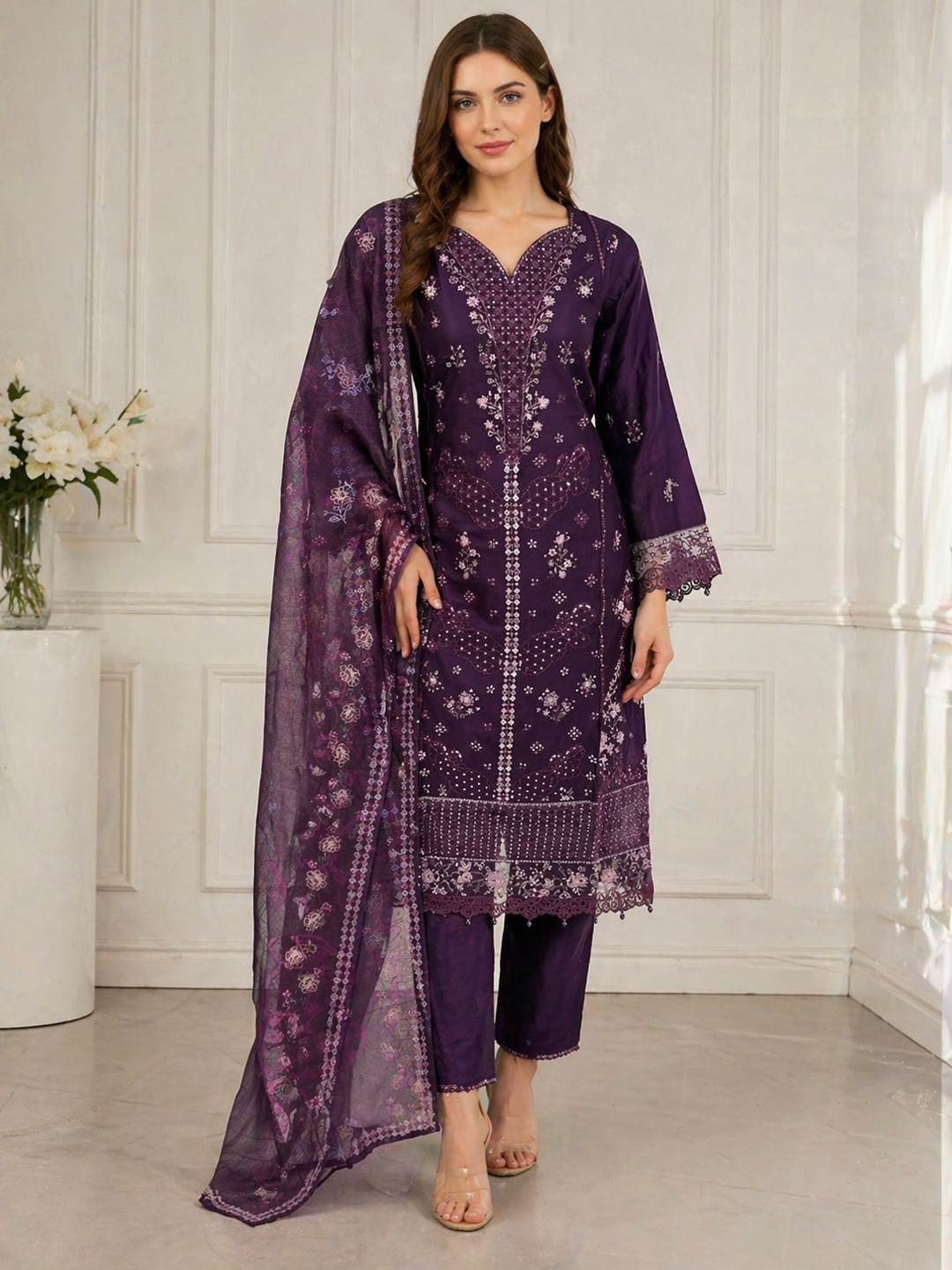 Three piece plain dhanak suit with shawl