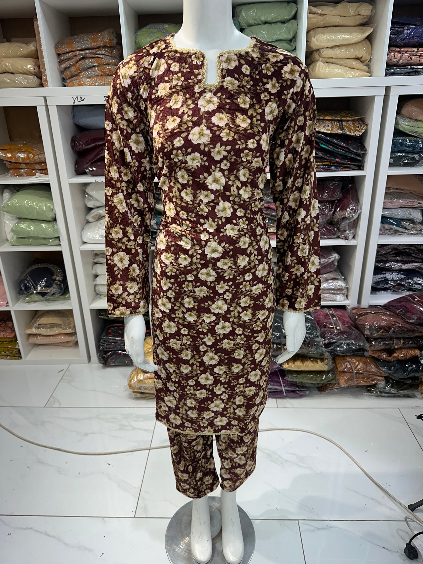 Two piece velvet suits in digital print perfect for winters and for everyday wear