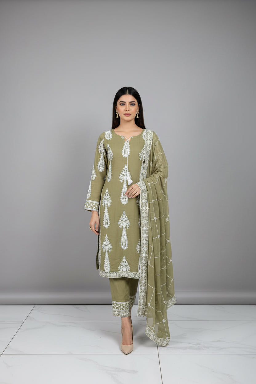 Three piece plain dhanak suit with shawl
